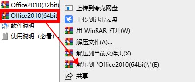 1、在本站下载office2010破解版之后,大家可以根据自己的电脑系统选择64位或32位,以64位为例,鼠标右击【Office2010(64bit)】压缩包选择(win11系统需先点击“显示更多选项”)【解压到 Office2010(64bit)】。