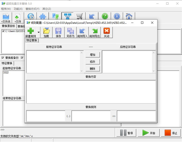 超级批量文本替换官方版是一款功能强大的批量文本替换工具,它可对段落文字进行批量替换,包括整段文字的替换以及特征字符串之间的批量替换,对成对的特征字符串之间的字符可实现提取功能,让你的文本修改更加得心应手。软件支持所有纯ANSI文件,支持GBK/Unicode/UTF8编码的htm、html、asp、java、php等文件,可自定义所支持的文件类型。此外,超级批量文本替换工具还可对熊猫烧香造成的挂马网页实行恶意代码清除,非常方便快捷。