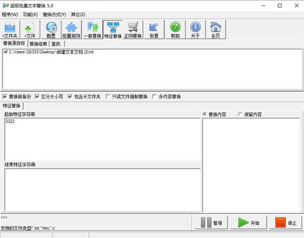 注意:在操作过程中根据所要求的不同,可以选择“替换前备份”、“区分大小写”、“包含子文件夹”、“只读文件强行替换”、“多内容替换”等选项