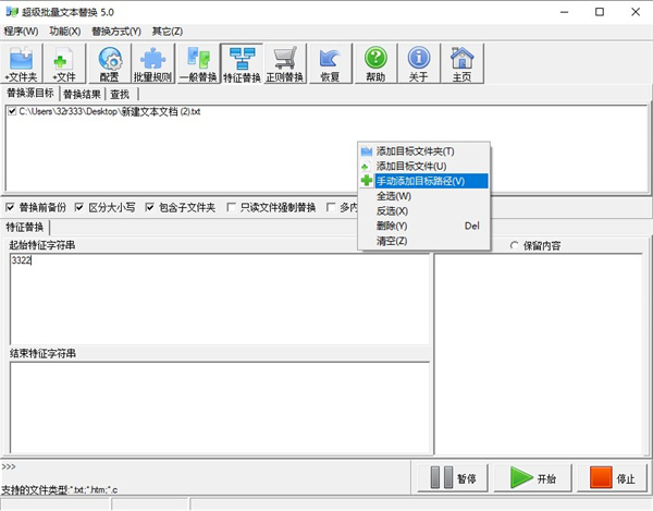 ①点击工具栏上的“+文件”按钮,选定要替换的文本,比如示例文本。txt,在“查找内容”项目的“替换源目标”选项夹中输入“3322”,在“替换内容”项目中输入“3322软件站”,点击开始,于是,会看到原来文本中的“3322”全部被“3322软件站”字样替换