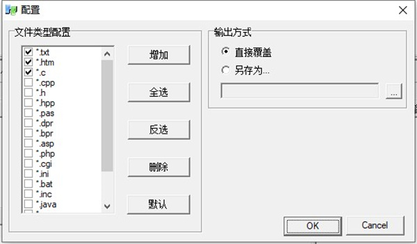 ①对文件中一对字符串所划定的区域进行处理,对于网页、编程源文件、这些文件的特点就是看上去非常的繁琐,不容易查询关键字等,比如txt、htm、c、h、cpp、asp、cpp、java等。通过点击工具栏上的“配置”,可以看到默认支持的文件类型,而且还可以“增加”进行定义没有的格式,同时,确定输出的方式,是直接在源文件上进行还是另外存储到别处